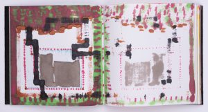 Des carnets de papiers couverts de feutre, d’alcool, de peinture, de traits et de lignes, de formes et d’informes.